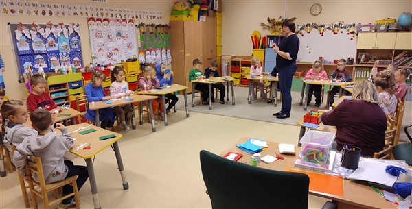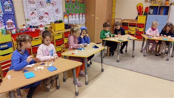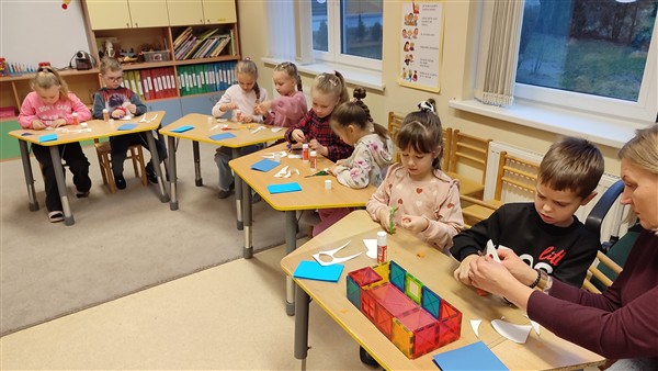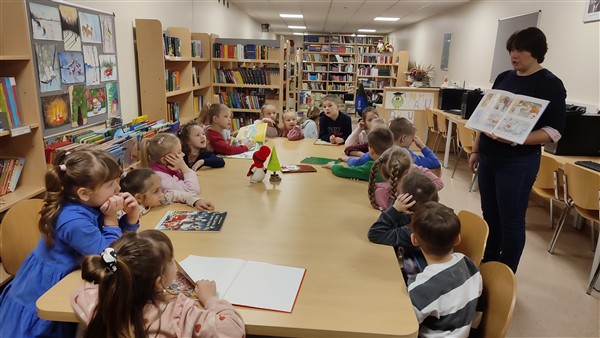 Grudžio 12 dieną priešmokyklinukai drauge su mokytojomis apsilankė bibliotekoje. Čia vaikai turėjo galimybę susipažinti su bibliotekos erdvėmis, taisyklėmis bei knygų pasauliu. Vėliau mažieji klausėsi bibliotekininkės skaitomos R. Briggs‘o knygos „Sniego Senis ir sniego Šunelis“. Po garsinio skaitymo priešmokyklinukai grupėje dalyvavo kūrybinėje veikloje – gamino atvirukus „Sniego Senius“. Skambant Kalėdinėms dainoms ši, bibliotekininkės pravesta edukacija, įkvėpė ir kūrė žiemišką bei šventinę nuotaiką.